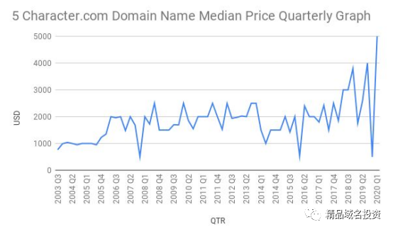 五字母.com域名继续飙升,目前在2020年第一季度的平均价格为7,975美元。